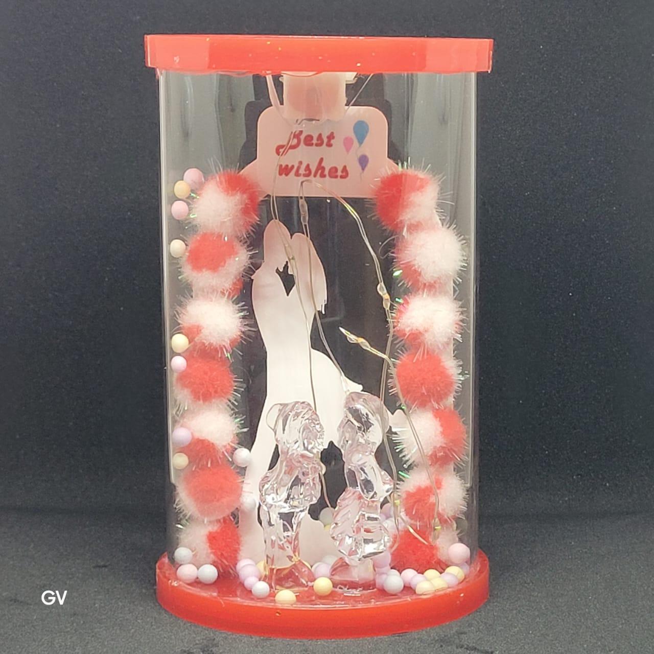 The "Best Wishes LED Decorative Light" is a beautifully crafted decorative piece that radiates elegance and charm. Featuring a romantic couple silhouette, accented by vibrant red and white pom-pom decorations, and adorned with delicate crystal figurines, this light is the perfect gift for weddings, anniversaries, or any special occasion. The soft LED lights create a warm, inviting ambiance, while the "Best Wishes" tag adds a thoughtful touch to your heartfelt gift. Its lightweight and compact design make it ideal for decorating bedside tables, shelves, or desks, bringing a touch of romance and positivity to any space.
