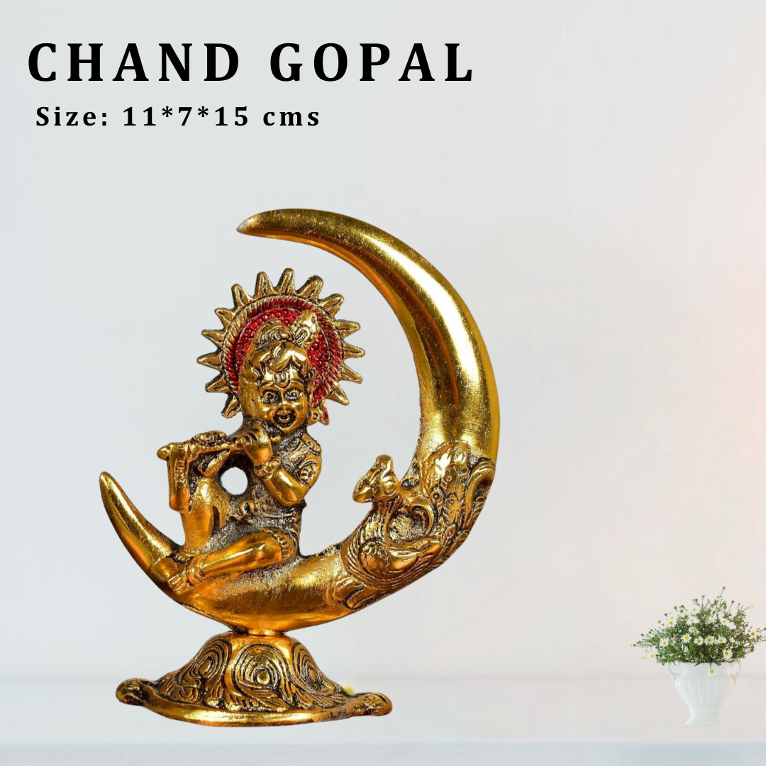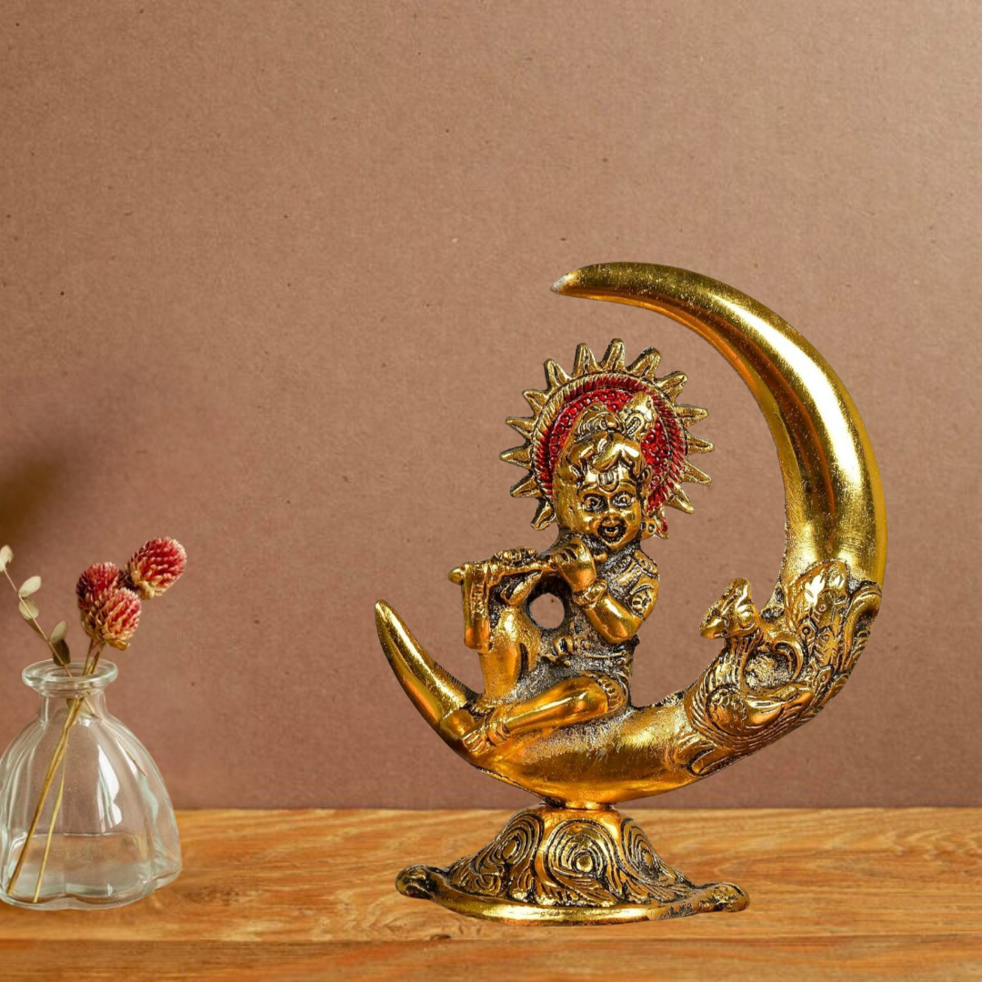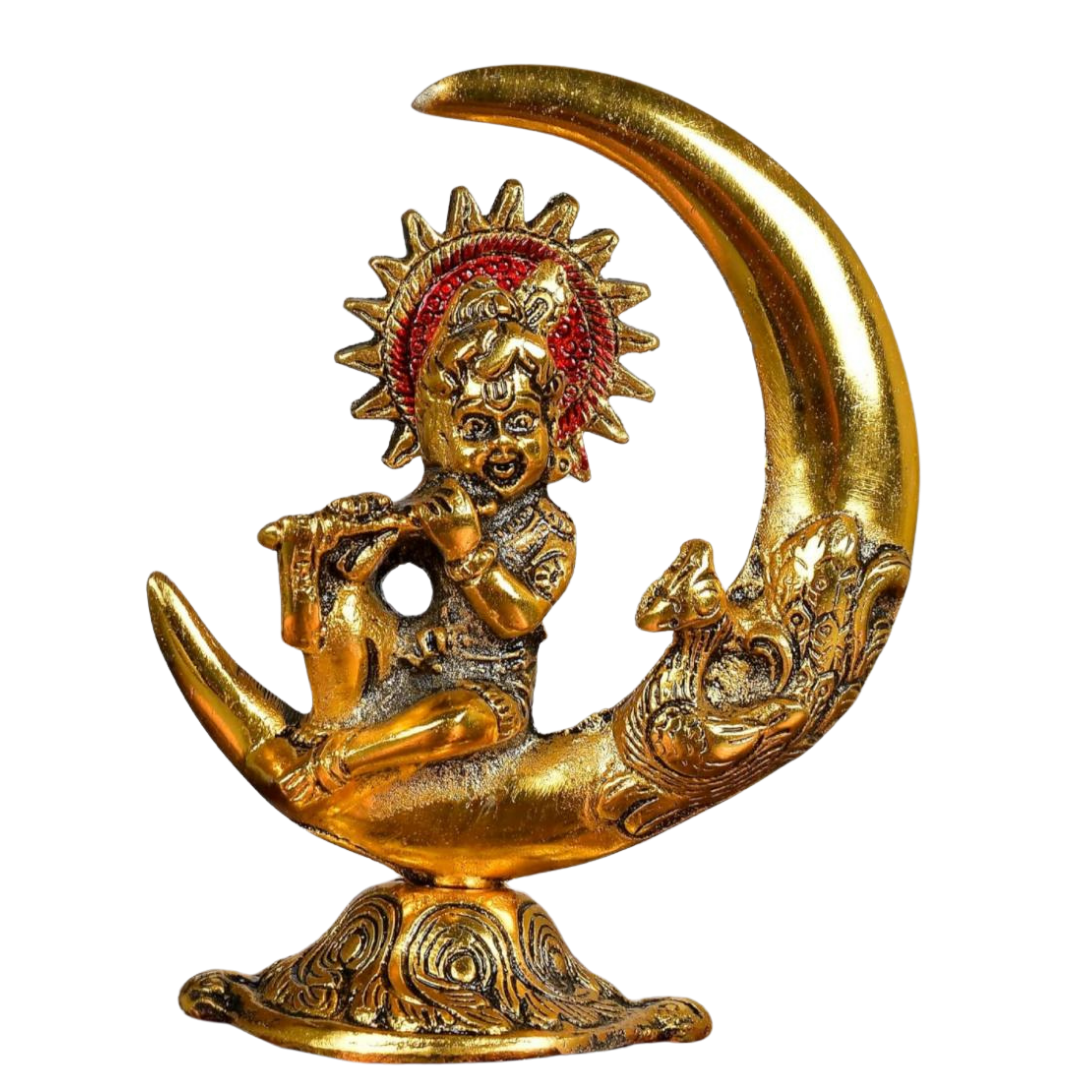 Bring home the divine grace of Lord Krishna with this exquisite Metal Gopal Krishna on Moon Idol. Crafted with intricate detailing, this elegant showpiece captures the serene beauty of Baby Krishna seated on a crescent moon. Ideal for pooja rooms, home décor, and office spaces, this statue radiates positive energy and spiritual charm. Its timeless design makes it a thoughtful gift for festivals, housewarmings, and special occasions.