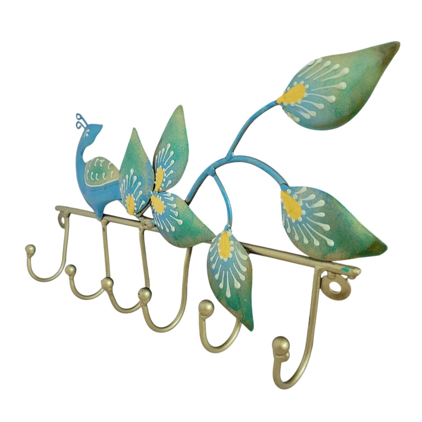 Peacock Key Holder Wall Art, 6 Iron Hooks, Gold and Blue Finish | Elegant Peacock Key Holder Wall Art – Iron Key Organizer with 6 Hooks (Gold & Blue)